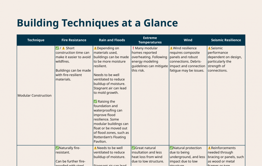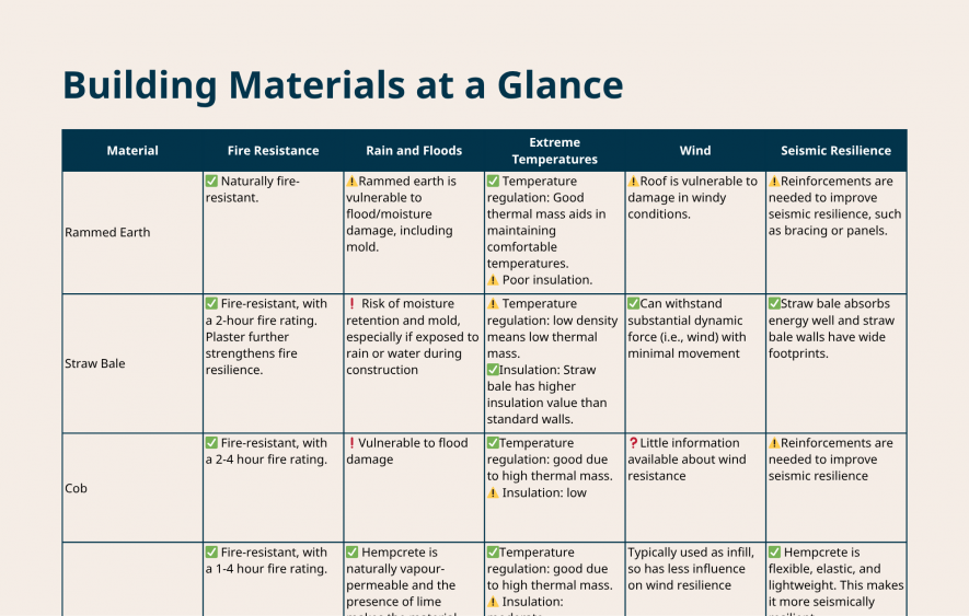 Communities are facing more and more intense climate-related hazards, including wildfires, heat domes, and extreme precipitation. Common contemporary building materials may not be the most resilient or sustainable option. This page compares the climate resilience of different building materials and design techniques to support communities’ building design and renovation decisions.