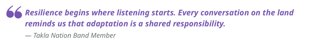 To ensure the work remains transparent and useful, key findings are shared through interactive GIS dashboards, plain-language summaries, and community discussions at Takla Landing. These tools help make science accessible, allowing community members to explore information at their own pace. By creating shared spaces for interpretation and decision-making, the project supports climate adaptation that is grounded in place, strengthened by collaboration, and guided by the principle that resilience grows when people and knowledge systems work together.