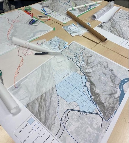Once participatory mapping of the different values was complete, we overlaid transparent maps of the major proposed flood management changes in the area. We could then see how proposed changes might intersect with areas of importance to the participants. We could then score the impact of different management options, along with the proposed increases or decreases in flood water amount in terms of whether it would harm or improve the wellbeing of each value. We adapted an Indigenous research method called the Mauri scale for this step, giving the likely lifeforce changes of each value numeric scores.