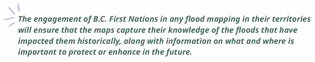 While flood mapping is a positive and essential tool, it is important to ensure the maps will serve First Nation interests and won’t inadvertently accentuate past harmful settler-driven flood management practices. It is important that B.C. First Nations are given culturally sensitive opportunities to influence on-going flood mapping activities, if they want to.