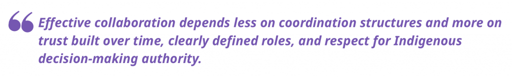Together, these insights highlight best practices for breaking down silos and facilitating collaboration, including centering Indigenous governance, investing in long-term relationships, and developing flexible measurement systems grounded in Indigenous definitions of success. They also offer practical recommendations for future research and partnerships: co-develop research priorities from the outset, prioritize relational accountability alongside technical expertise, and design evaluation frameworks that support learning, adaptation, and long-term stewardship rather than short-term outputs.