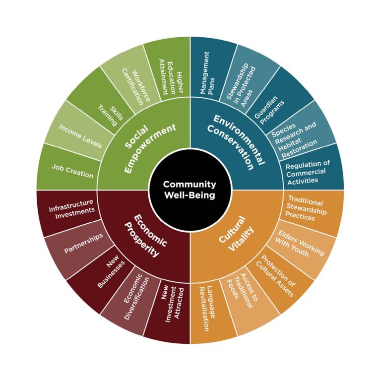 The Community Well-Being Outcomes Framework offers an important lens for understanding how Indigenous Nations define and evaluate the impacts of conservation and stewardship investments. Rather than prioritizing narrow economic or environmental indicators, the framework reflects a holistic understanding of well-being that integrates environmental conservation, cultural vitality, social empowerment, and economic prosperity as interconnected and mutually reinforcing.