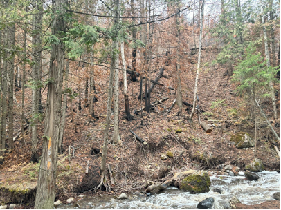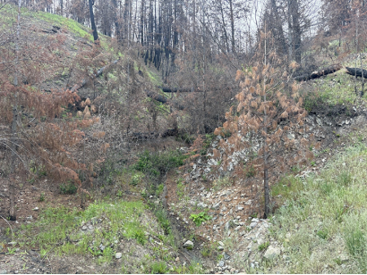 Figure 1. Left: Whiteman Creek, 3 years after the wildfire. Right: McDougall Creek, 1 year after the wildfire. Credit: Shixuan Lyu, 06/24.
