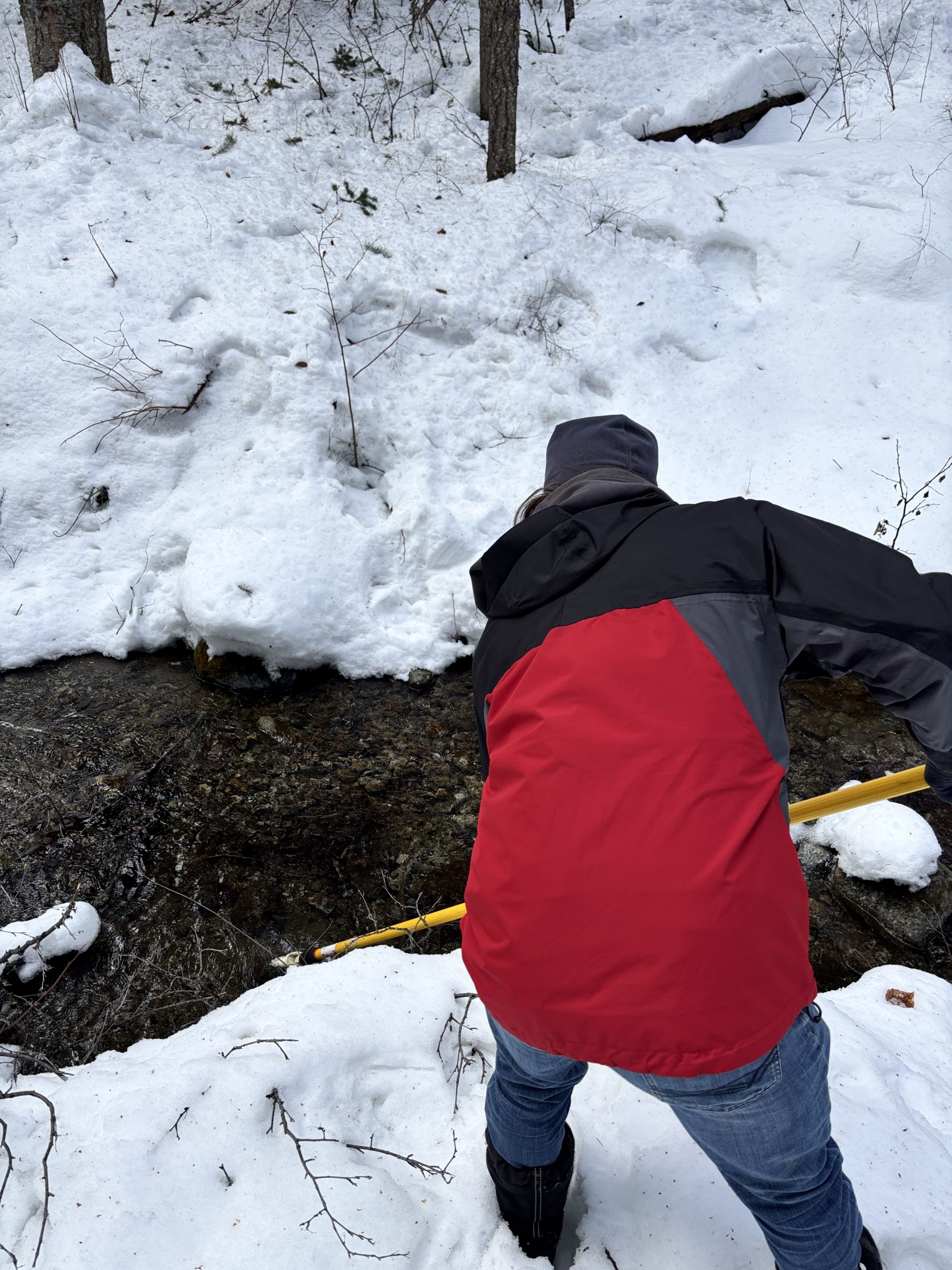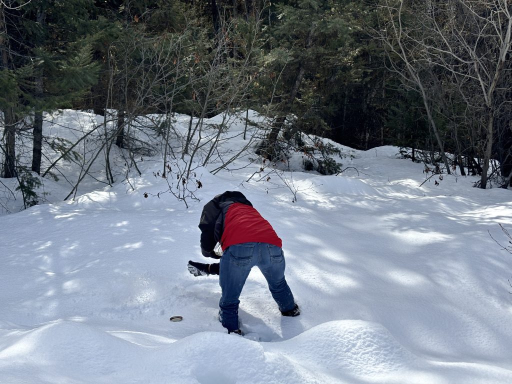 Figure 3. Left: Our team member, Gavin Newall, collecting a water sample from McDougall Creek. Right: Gavin collecting a snow sample for testing. Credit: Shixuan Lyu, 03/25.