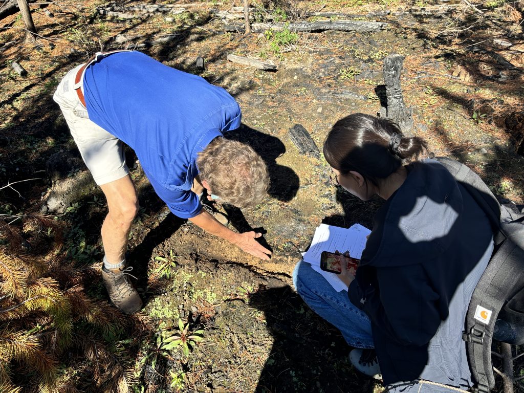 Figure 6. Left: Visiting expert, Prof. Keith Smettem, surveying the burned area in McDougall Creek. Credit: Shixuan Lyu. Right: Our research team with the Indigenous high-school student who joined us for the summer seed2STEM program. Credit: seed2STEM team.