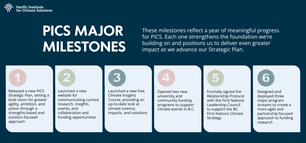 This past year (2024-2025) has been transformative for the Pacific Institute for Climate Solutions (PICS). Guided by a renewed sense of purpose, we launched our new Strategic Plan, setting a clear course to accelerate climate action across British Columbia and beyond. The plan reaffirms our mission to mobilize cutting-edge research, collaboration, and knowledge exchange that create tangible, lasting climate solutions.
